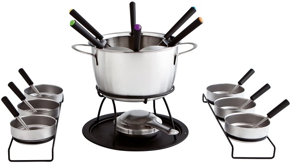 Excelente para preparar e servir com estilo diversas refeições de carne, queijo ou chocolate. O Fondue serve para 6 pessoas.Tem 6 taças, 6 colheres e 6 garfos, chama ajustável.